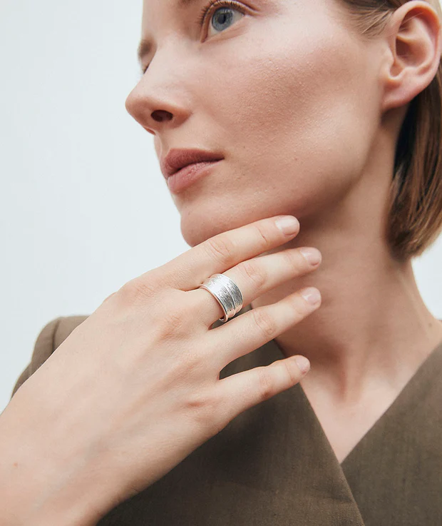 Anillo Curve bañado con una gruesa capa de Plata de ley 925, lo que garantiza una mayor durabilidad. Está disponible en dos tallas: la talla 12-14, con un diámetro interior de 16,5 mm a 17,2 mm, y la talla 16-18, con un diámetro interior de 17,8 mm a 18,4 mm.