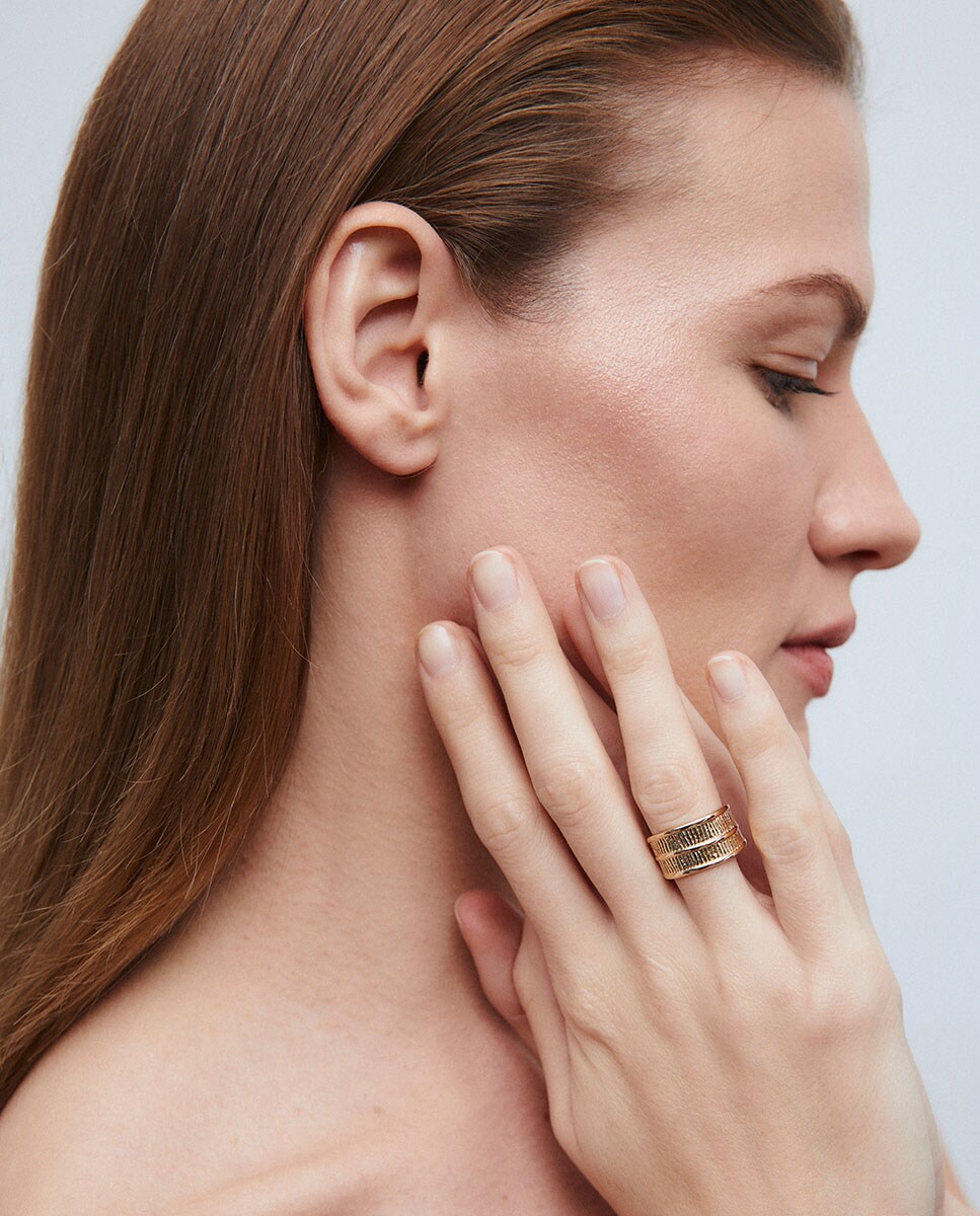 Anillo entrelazado dual Horizonte bañado con una gruesa capa de oro macizo de 18 kt, lo que garantiza una mayor durabilidad.