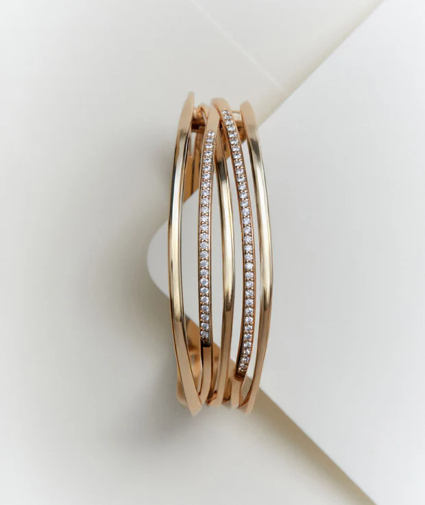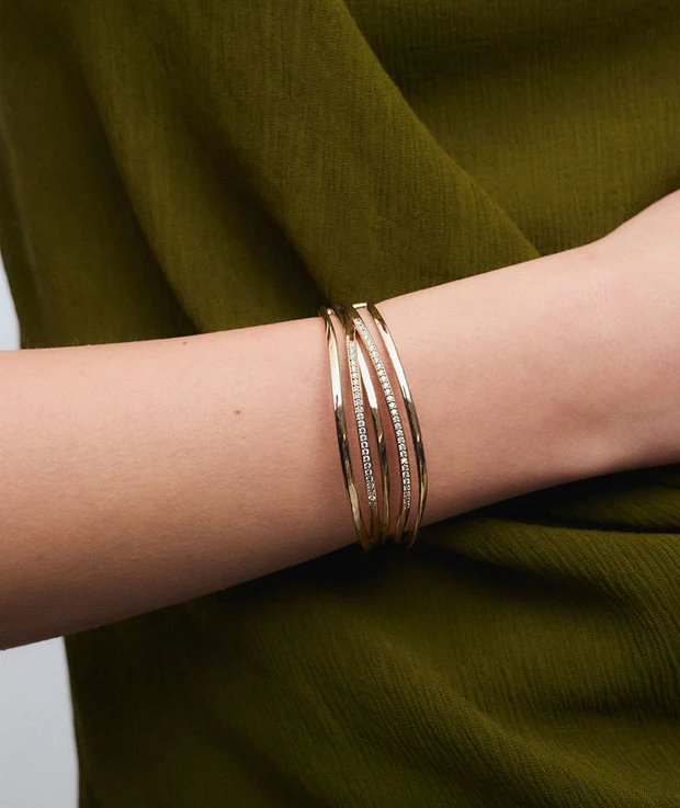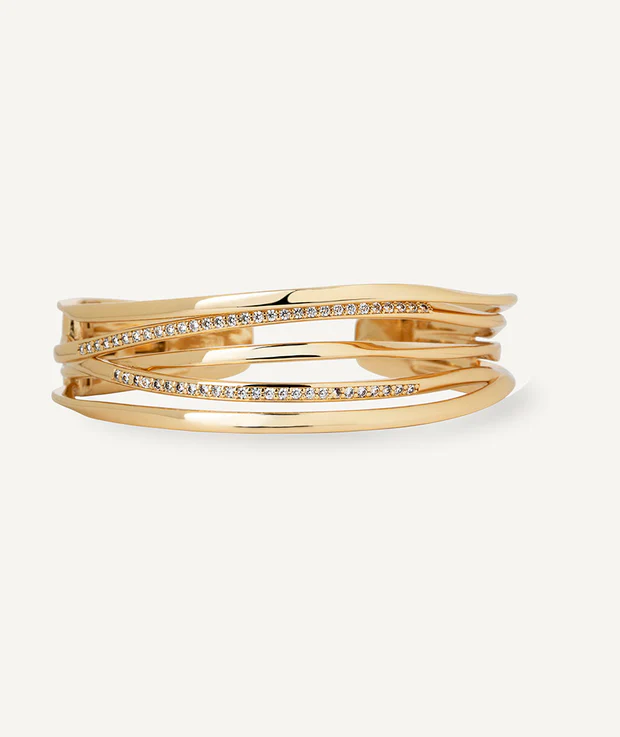 Brazalete Flow bañado con una gruesa capa de oro macizo de 18 kt, lo que garantiza una mayor durabilidad. Engastado con circonitas blancas, cuya similitud con el diamante es casi indistinguible. Tiene una medida de 50 x 60 mm.