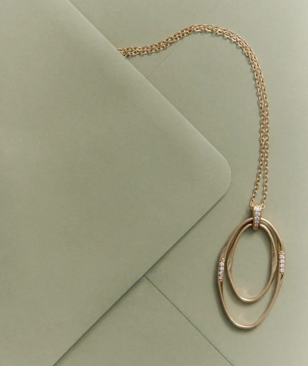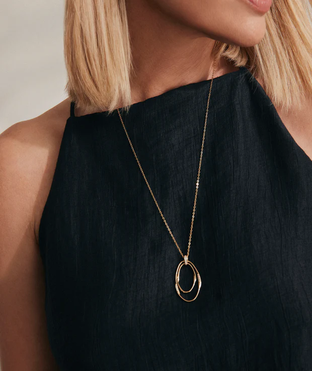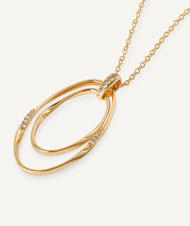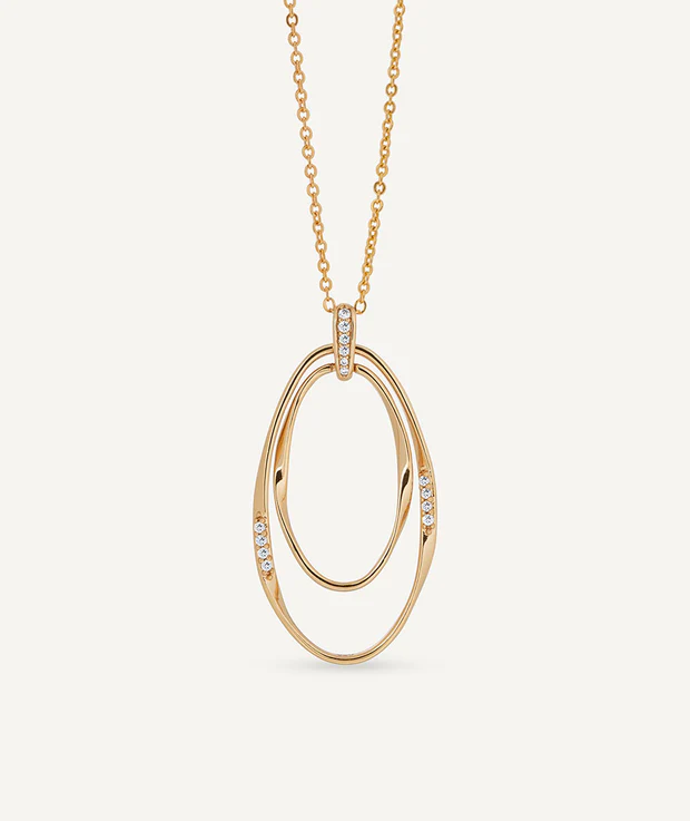 Colgante ovales Flow bañado con una gruesa capa de oro macizo de 18 kt, lo que garantiza una mayor durabilidad. Engastado con circonitas blancas, cuya similitud con el diamante es casi indistinguible.Tiene una medida de 45 mm / 60 cm + 6 cm de cadena ajustable.