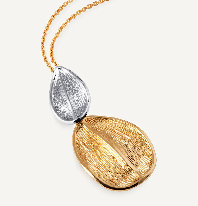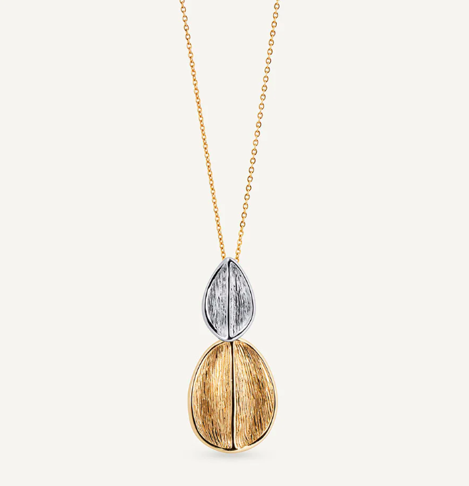 Collar hojas Curve Dúo bañado con una gruesa capa de oro macizo de 18 kt, lo que garantiza una mayor durabilidad. Tiene una longitud de 42 + 5 cm de cadena ajustable. El diseño bicolor, que fusiona el dorado cálido con el baño de plata, refuerza su potencial para destacar en estilismos monocolor. Pertenece a la Colección Texturas, el nuevo conjunto Curve, una propuesta que nace del poder del contraste: la combinación de acabados mate y pulido espejo. Joyas que ofrecen fuerza y elegancia en una sola elección. Ideales para transformar un look sencillo en una declaración de sofisticación.