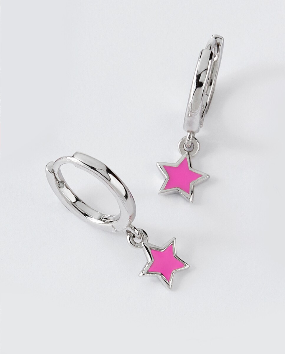 Pendientes de aro con estrella, plata de 1ª ley con esmalte rosa fucsia.