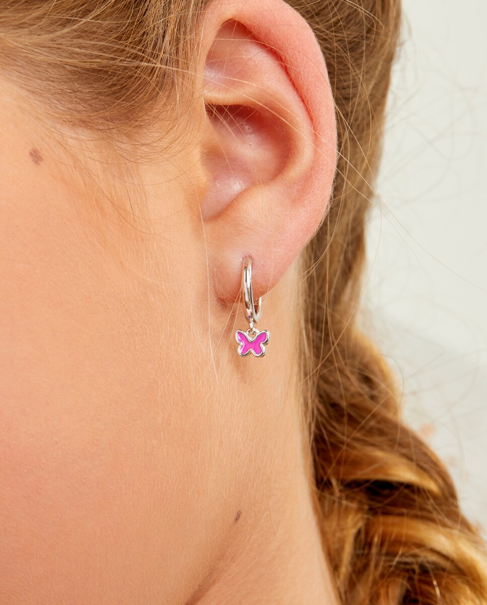Pendientes de aro con mariposa con esmalte fucsia, plata de 1ª ley.