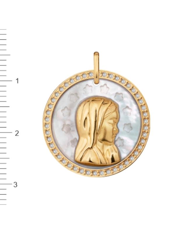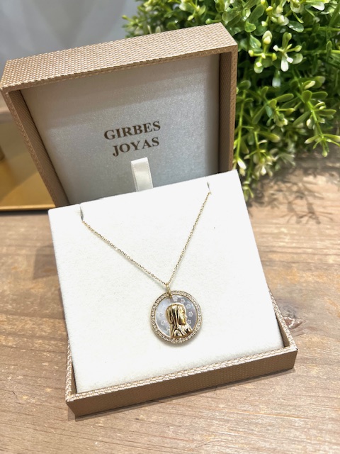 Medalla con la imagen de la Virgen Niña en Oro de 18kts, nácar por la parte trasera y orla alrededor de circonitas.