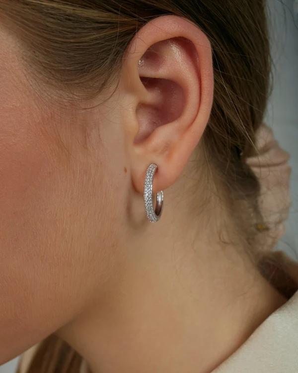 Pendientes con carril de circonitas blancas engastadas. Tamaño grande. Unos pendientes muy básicos, atemporales y sencillos que darán un toque trendy a tus looks de día , y chic a los de noche.