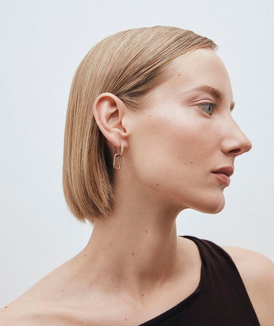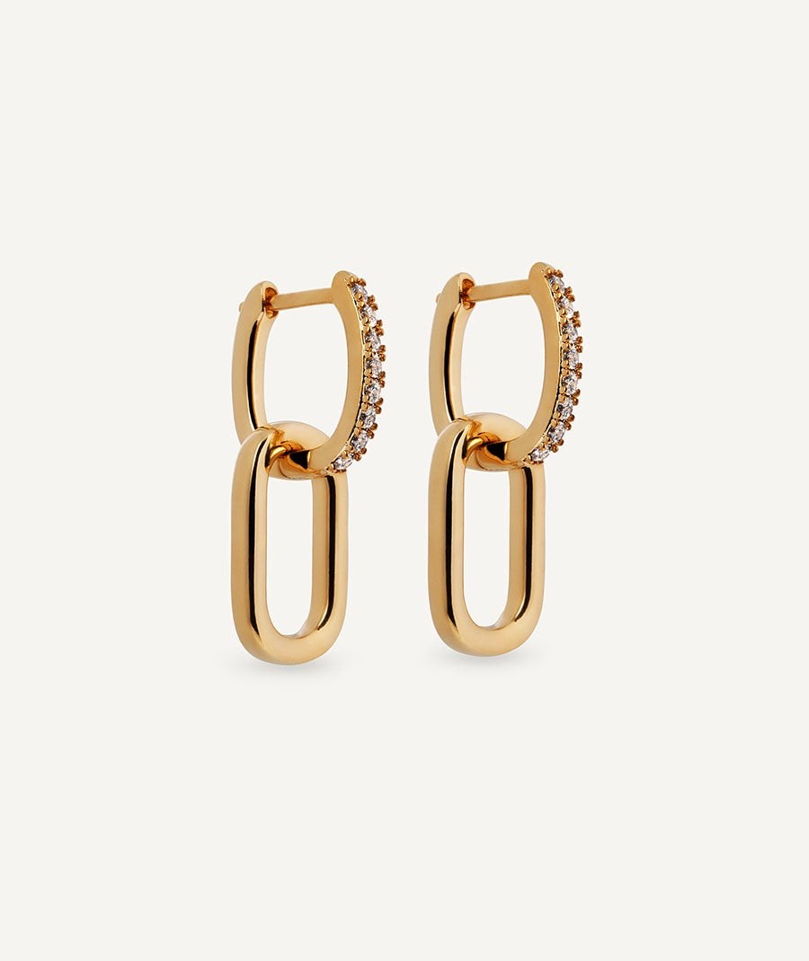 Pendientes de aro eslabones bañados con una gruesa capa de oro macizo de 18 kt, lo que garantiza una mayor durabilidad. Engastados con circonitas blancas de brillo intenso, cuya similitud con el diamante es casi indistinguible.