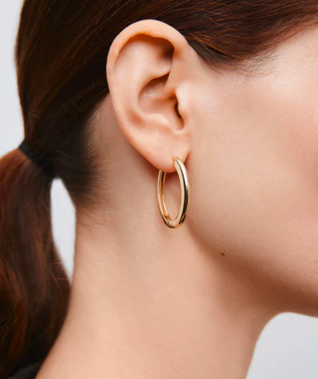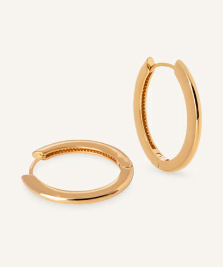 Pendientes de aro Jana bañados con una gruesa capa de oro macizo de 18 kt, lo que garantiza una mayor durabilidad. Tienen una longitud de 30 x 25 x 3 mm y un cierre de aro articulado.