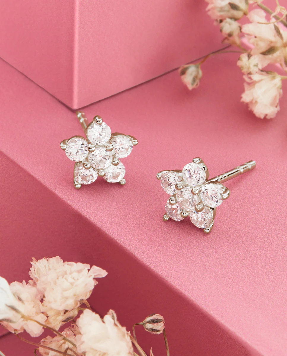 Pendientes de botón de estrella con circonitas, plata de 1ª ley esmalte blanco.