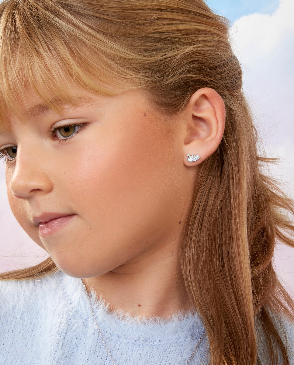 Pendientes de botón con cisne, plata de 1ª ley con esmalte. Cierre: a presión. Material: Plata de Ley 925. Medida: 5mm