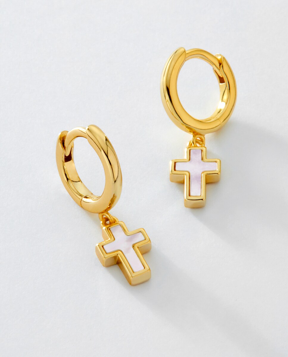 Pendientes cruz nácar. Plata de 1ª Ley baño en oro de 18k. Cierre huggy. Material: Plata de 1ª Ley 925 mil. Medida: Hoop: 10 mm Cruz: 8mm*6mm