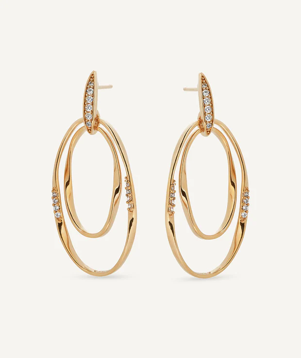 Pendientes largos ovales Flow bañados con una gruesa capa de oro macizo de 18 kt, lo que garantiza una mayor durabilidad. Engastados con circonitas blancas, cuya similitud con el diamante es casi indistinguible. Tienen una medida de 37,4 mm y un cierre a presión.