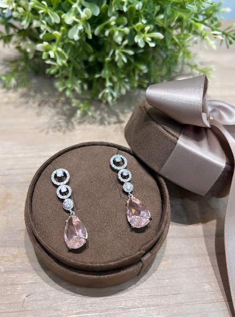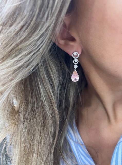 Pendientes de Oro Blanco de 18kts cuajado de circonitas con tres motivos y cuarzo rosa en talla pera.