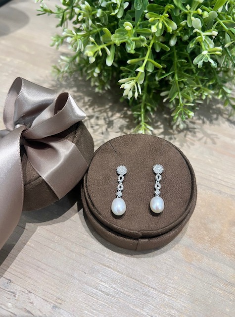 Pendientes Oro Blanco 18kts con Diamantes y Perla cultivada