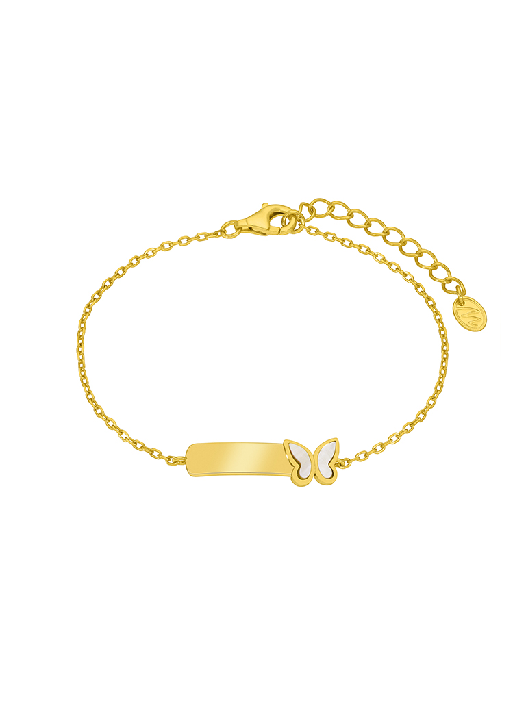 Pulsera de cadena con placa y grabable y mariposa. Plata de 1ª ley bañada en oro de 18k.