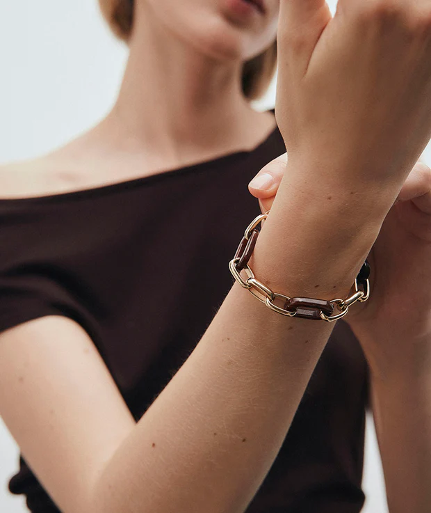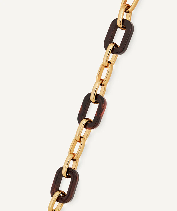 Pulsera eslabones Coffee bañada con una gruesa capa de oro macizo de 18 kts, lo que garantiza una mayor durabilidad. Destaca por el acetato y la resina en tono marrón, que aportan un aire de sofisticación en clave neutra. Tiene una longitud de 18 cm + 4 cm de cadena ajustable.