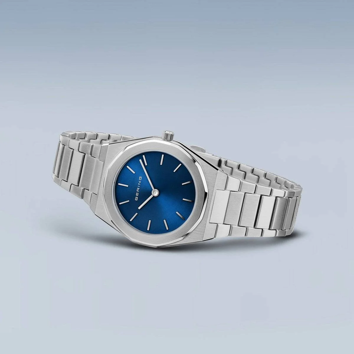 Reloj Bering para mujer de la colección Classic fabricado en acero inoxidable plateado con acabado pulido. Estamos ante un reloj de diseño clásico lleno de atractivo compuesto por bisel plateado con caja de 32mm de diámetro con esfera tornasolada en azul que contiene indicadores y agujas en color negro movidas por mecanismo de cuarzo analógico.