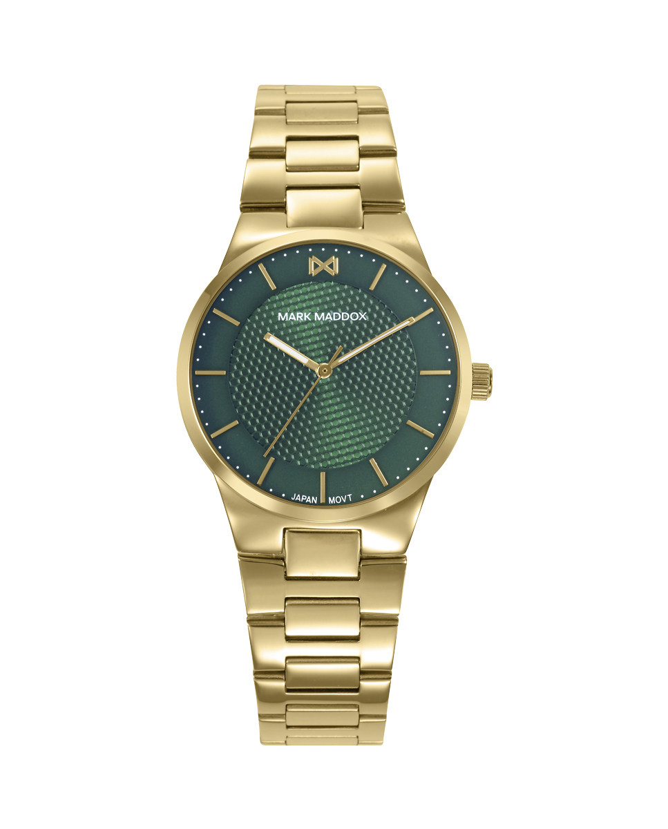 Este reloj de mujer combina diseño y funcionalidad, con caja y brazalete de acero IP dorado que destacan por su brillo sofisticado. La esfera verde, con índices y agujas en IP dorado, aporta claridad y estilo, protegida por un cristal mineral de alta calidad.