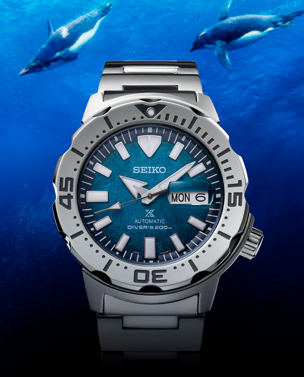 Hay unos pequeños detalles de pingüinos en la esfera. Esta versión Monster de 42 ,4 mm está montada sobre un brazalete de acero y está diseñada para soportar las condiciones extremas de los deportes acuáticos con su resistencia al agua hasta 200 metros.