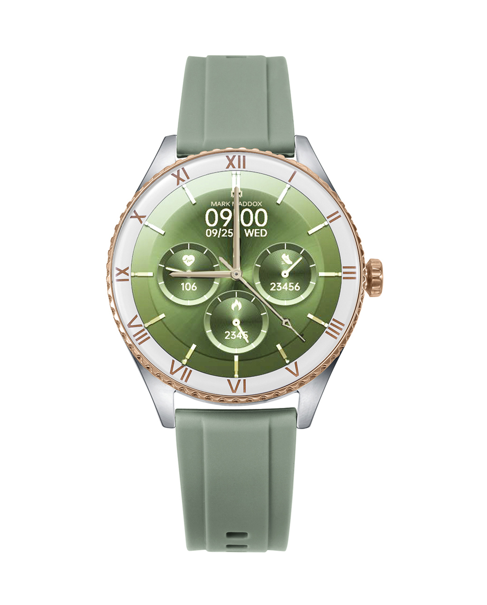 El smartwatch Mark Maddox Smartnow combina un diseño vanguardista y multifuncionalidad para acompañarte en cada momento del día. Su elegante caja de metal bitono en acero e IP rosa, junto con la correa de silicona verde, crean un contraste moderno y atractivo, ideal para quienes buscan destacar con estilo. Su pantalla táctil intuitiva te permite acceder fácilmente a sus múltiples funciones, y su compatibilidad con teléfonos Android 11 o superior e iOS 12 o superior asegura versatilidad y conectividad fluida. Este smartwatch incluye funciones esenciales para mantenerte conectado y activo: aviso de llamadas, notificaciones y mensajes, además de la posibilidad de realizar llamadas directamente desde el reloj. Incorpora un monitor de oxígeno en sangre, contador de pasos y medición de distancia recorrida, ideal para llevar un control preciso de tu actividad física. Además, ofrece gestión de deportes, cronómetro y monitoreo de la calidad del sueño, brindándote herramientas para cuidar tu bienestar de manera integral. Las funciones adicionales incluyen alarmas, control remoto de la cámara y la posibilidad de localizar tu teléfono, asegurándote comodidad y tranquilidad en todo momento. El Mark Maddox Smartnow es más que un smartwatch; es un accesorio de estilo, diseñado para aquellos que buscan funcionalidad y un diseño sofisticado que se adapte a su vida diaria.