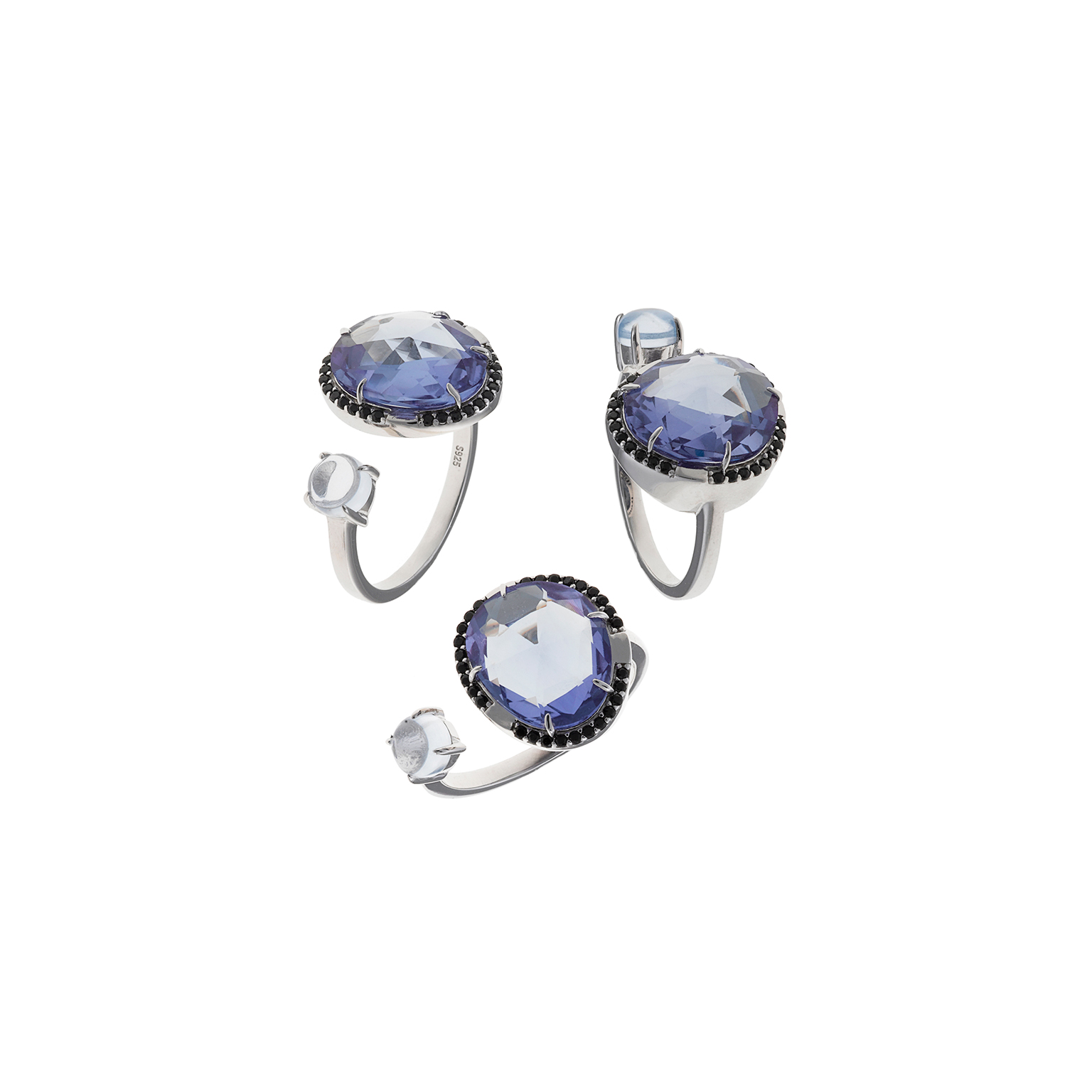 Sortija en plata ley rodiada con una piedra de aguamarina ovalada en color azul corundum claro. Lleva alrededor espinelas en color negro.